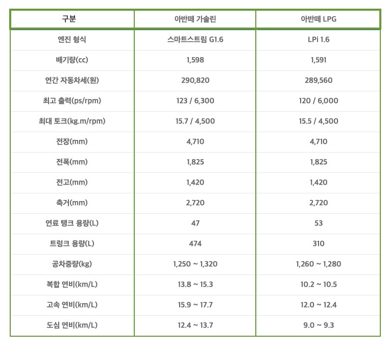현대 아반떼는 가솔린 모델 외에도 1.6L LPG 모델을 제공하기도 합니다. LPG 모델의 시작 가격은 2,115만 원이며, 풀옵션 LPG 모델의 가격은 2,908만 원으로 가솔린 모델보다 약간 높습니다.